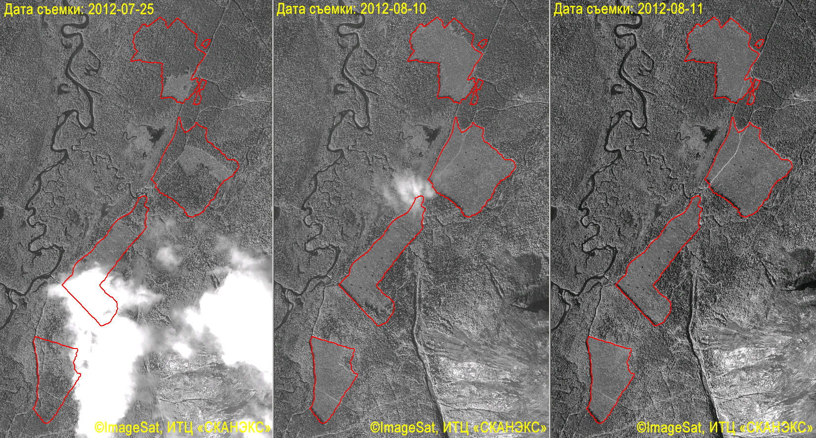 | Динамика вырубки леса под будущую инфраструктуру апатит-нефелинового месторождения Партомчорр. Красным контуром показаны границы вырубок на 11 августа. Слева: снимок EROS B за 25.07.12. В центре: снимок EROS B за 10.08.12. Справа: снимок EROS B за 11.08.12 (с)ImageSat, ИТЦ "СКАНЭКС" |